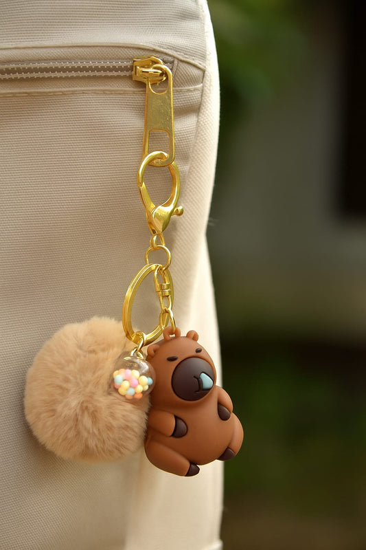 Breloc capybara cu muc, maro cu puf bej și biluțe colorate, accesoriu drăguț pentru chei sau geantă