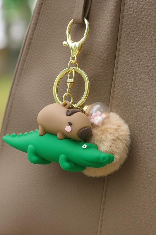 Breloc capybara pe crocodil, maro cu puf bej si bilute colorate, accesoriu dragut pentru chei sau geanta