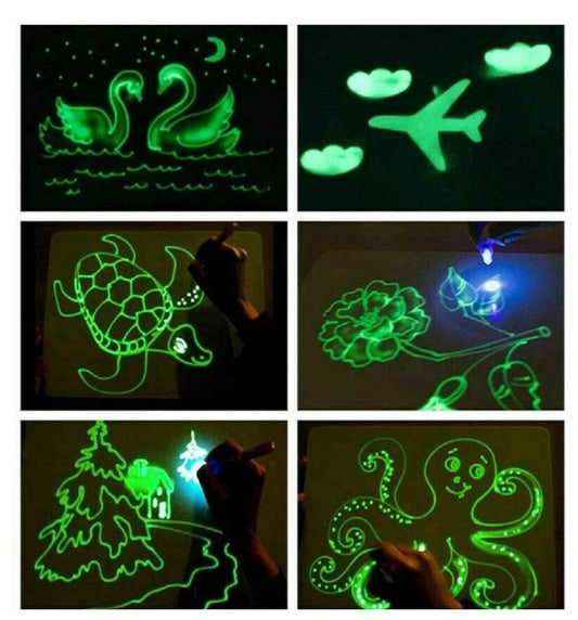 Set de desenat cu lumină – tăbliță A4 fosforescentă, rescribibilă, cu marker invizibil UV