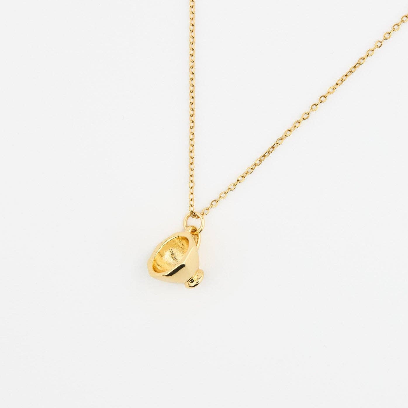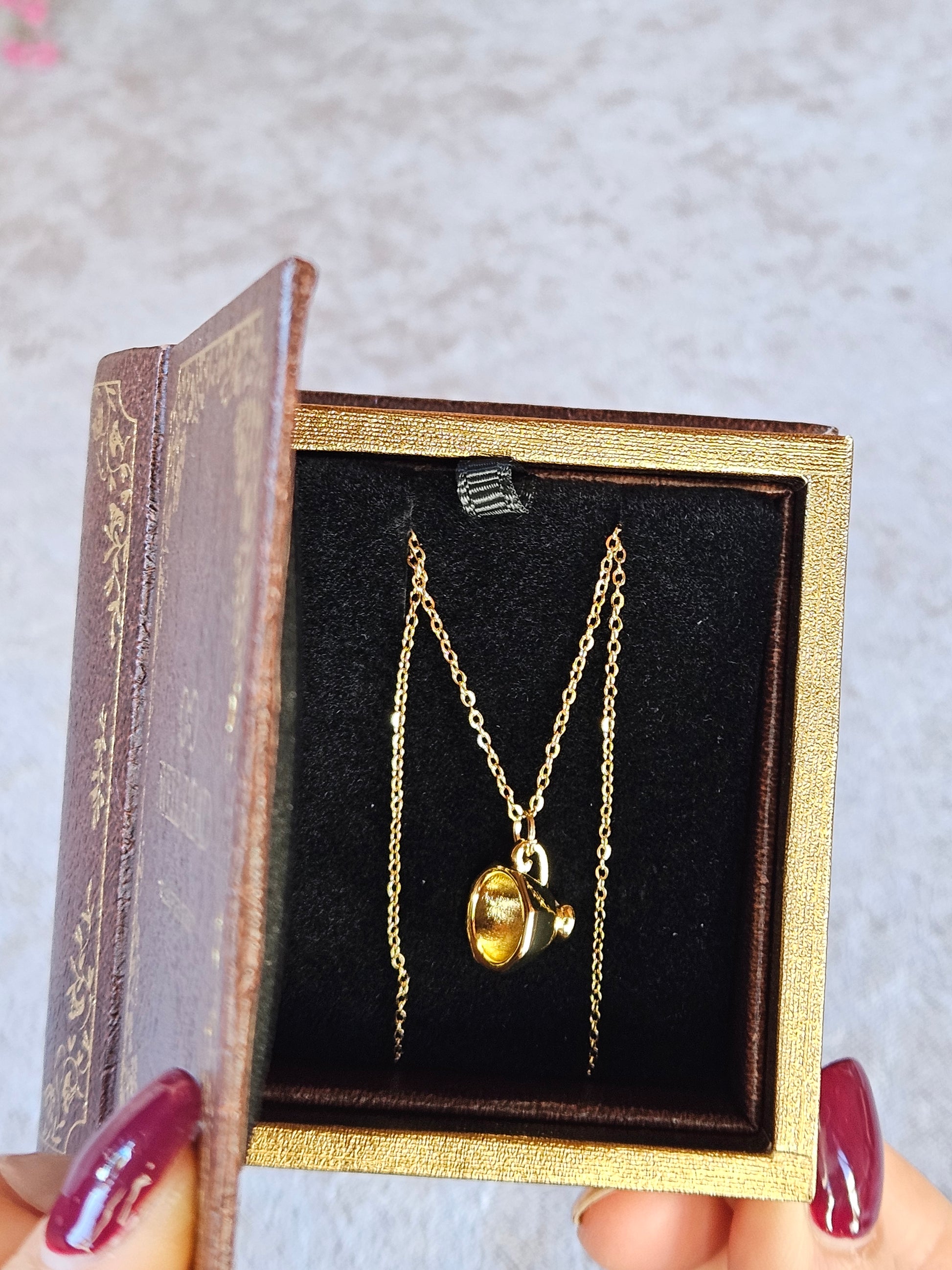 Pandantivul impresionează prin detalii fine – de la toarta delicată a ceștii până la finisajul perfect lustruit – păstrând totodată o strălucire aurie luxoasă.