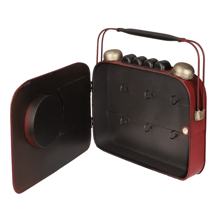 Cutie pentru chei realizată din metal, cu design decorativ inspirat de un radio clasic, completată de un ceas analog cu cifre romane.