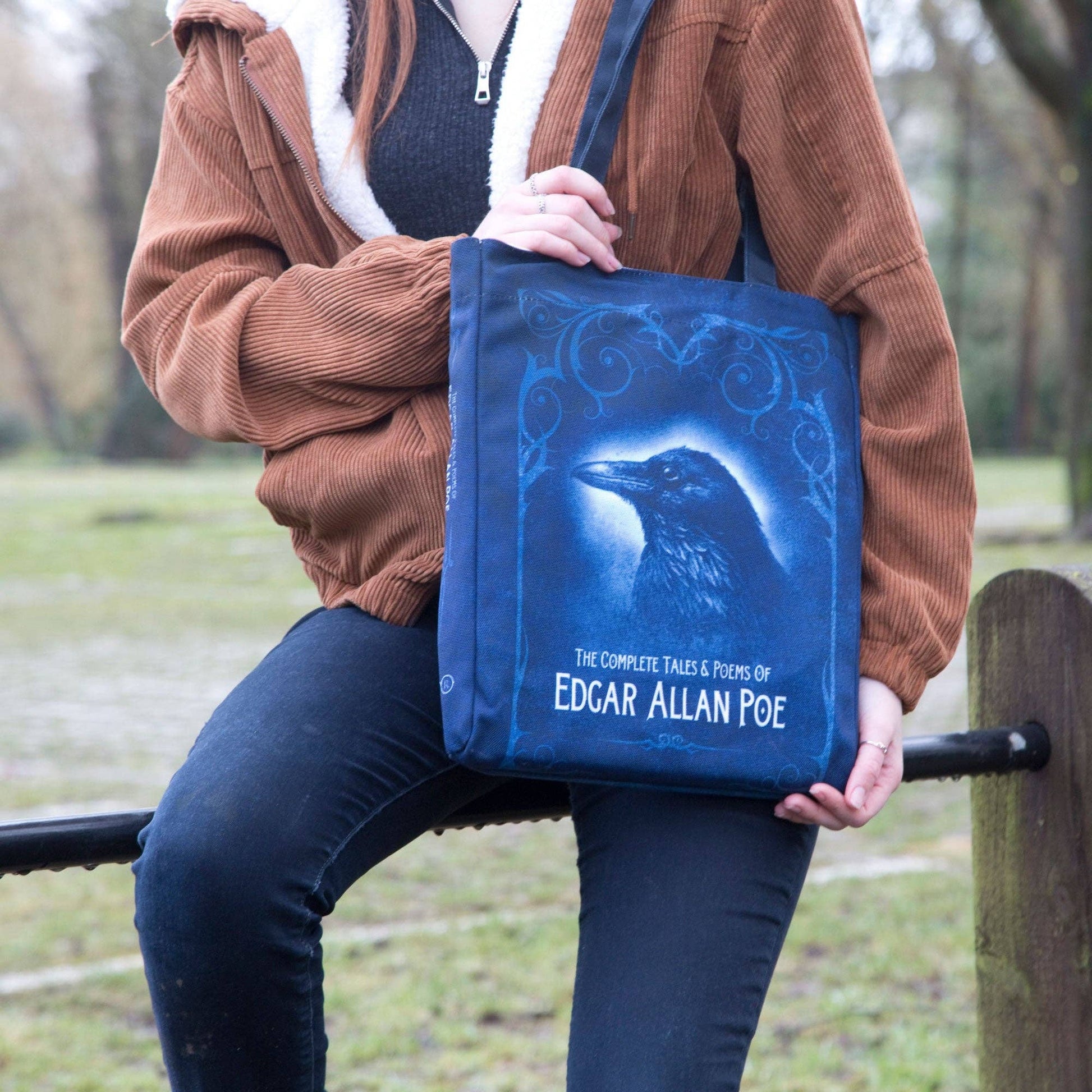 Acest tote bag practic, inspirat de clasicul Collection of Tales and Poems de Edgar Allan Poe, prezintă un fundal albastru închis și un corb mare și impresionant.