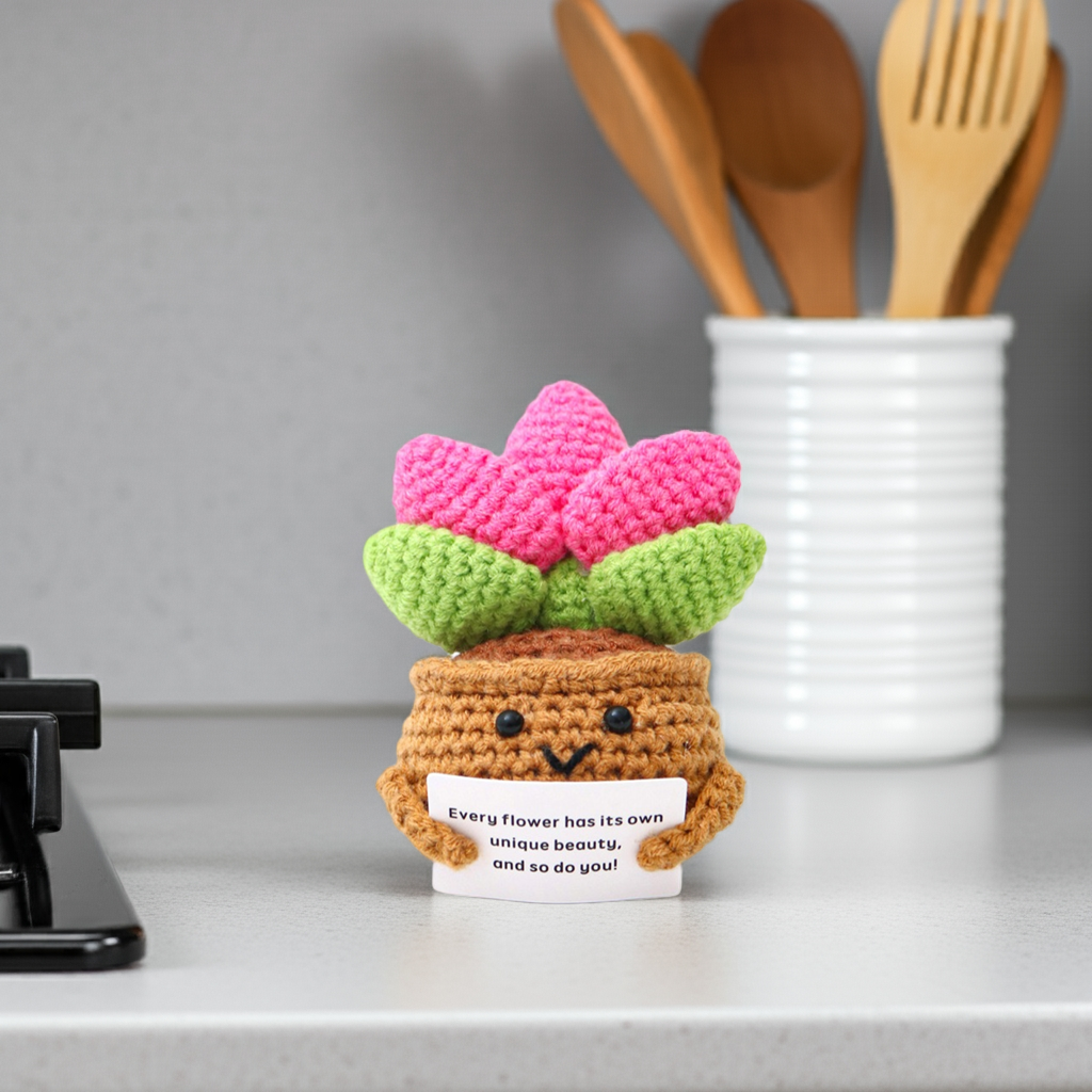 Floare croșetată în ghiveci, în formă de cactus, Positive Flower, cu mesaj motivațional