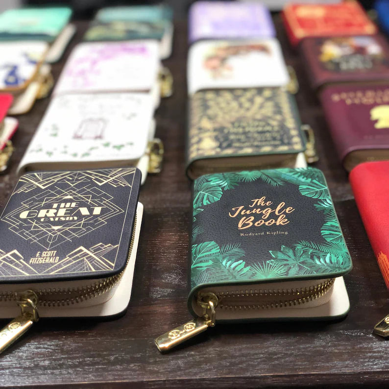 Portofel cu tematică literară – portofelul cu fermoar este inspirat de cărțile cu copertă tare și este realizat din piele ecologică.