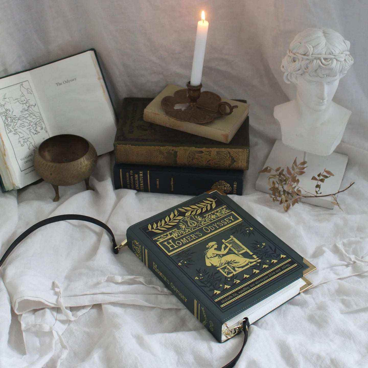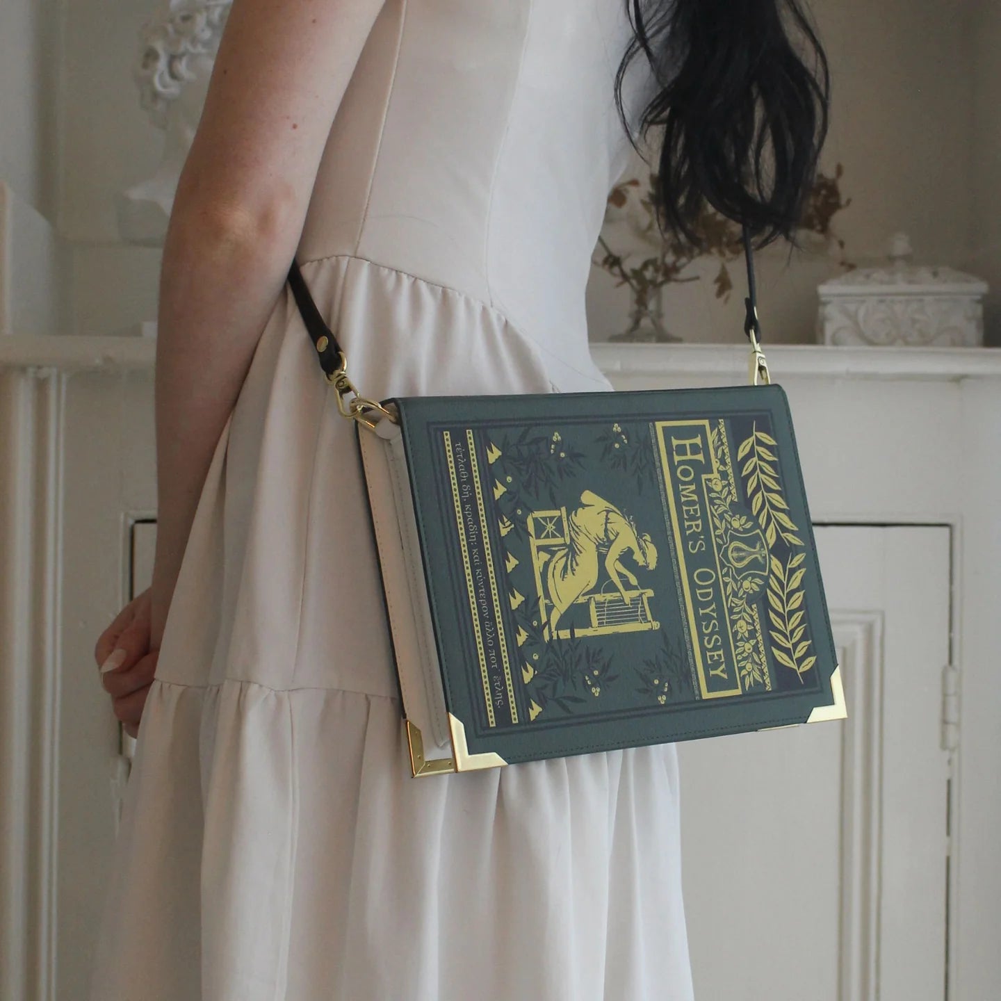 Îmbrăcată într-un verde măsliniu profund, cu accente de auriu antic, acest design evocă un volum clasic legat în pânză aurită: titlul încununat cu lauri, emblema lirei și Penelopa la războiul ei de țesut împodobesc partea frontală a genții.