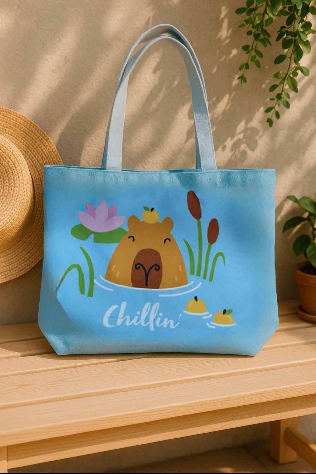 Cu un design vesel și o capybara relaxată pe fațadă, această geantă adaugă un plus de stil și distracție, oferind în același timp un spațiu generos pentru toate lucrurile necesare zilelor însorite.