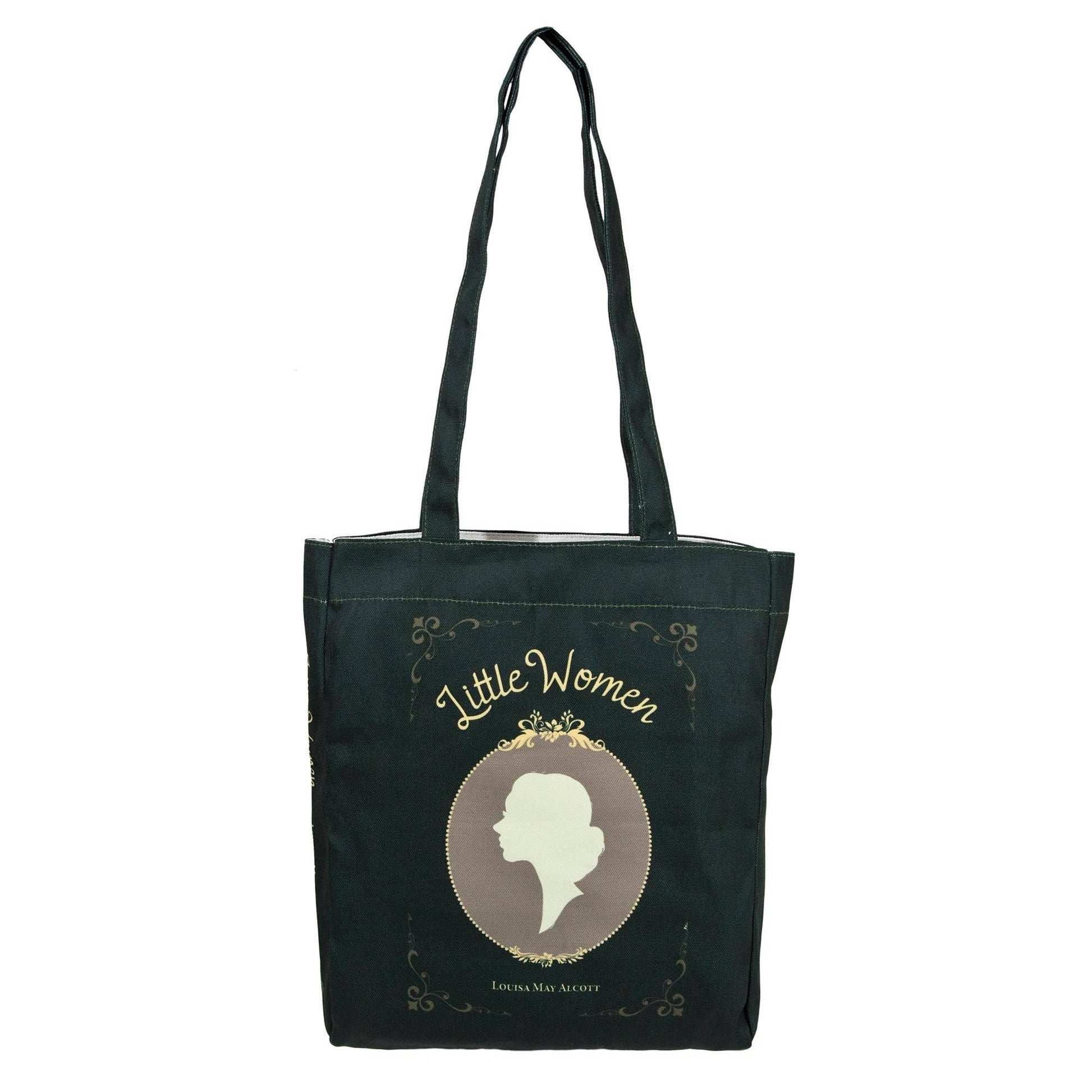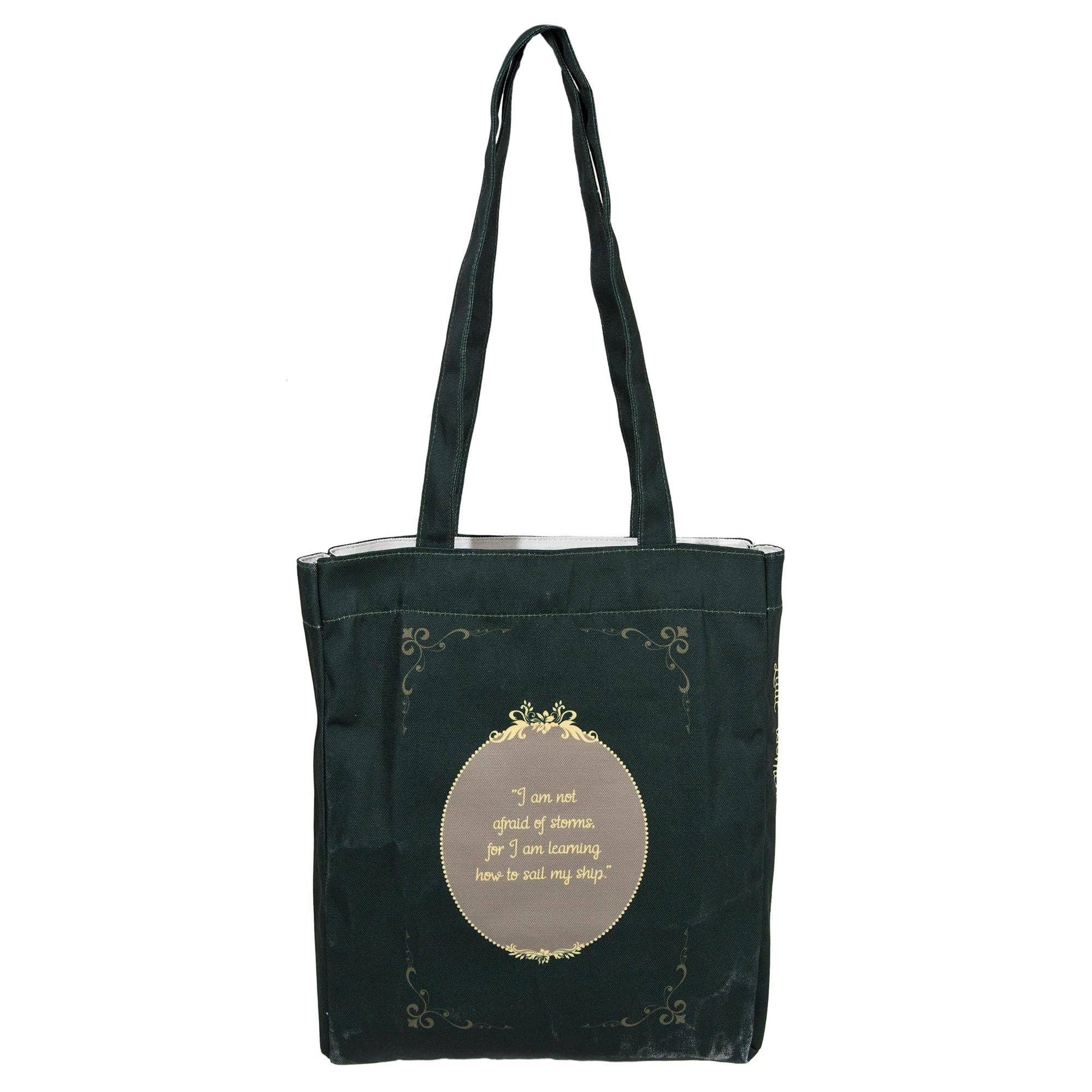 Inspirat de Little Women de Louisa May Alcott, tote-ul verde prezintă un frumos design cu profilul unei tinere.