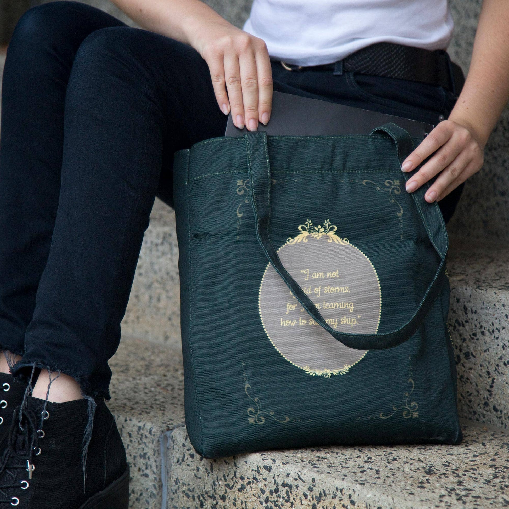 Fabricat 100% din poliester, pe spatele genții se regăsește citatul atemporal: ‘I am not afraid of storms, for I am learning how to sail my ship’.