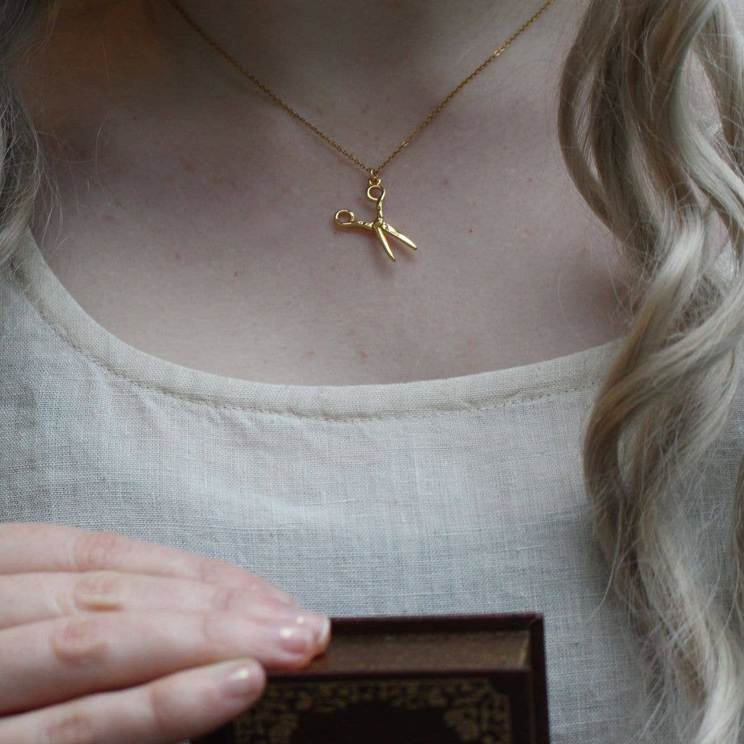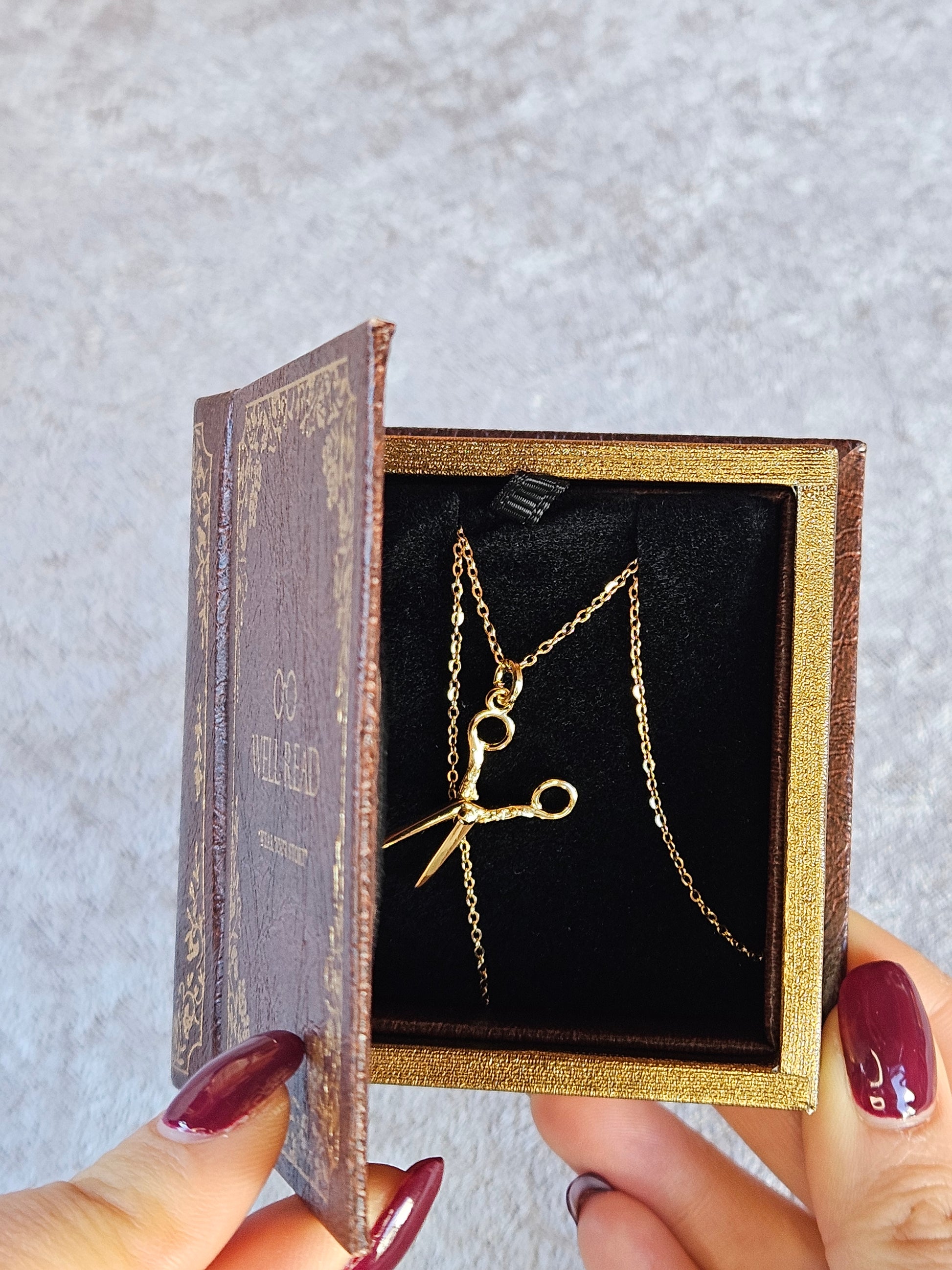 Pandantivul fermecător prezintă o pereche delicată de foarfece aurii, un omagiu subtil pentru activitățile creative ale surorilor March și scenele domestice care definesc celebrul roman al lui Louisa May Alcott.