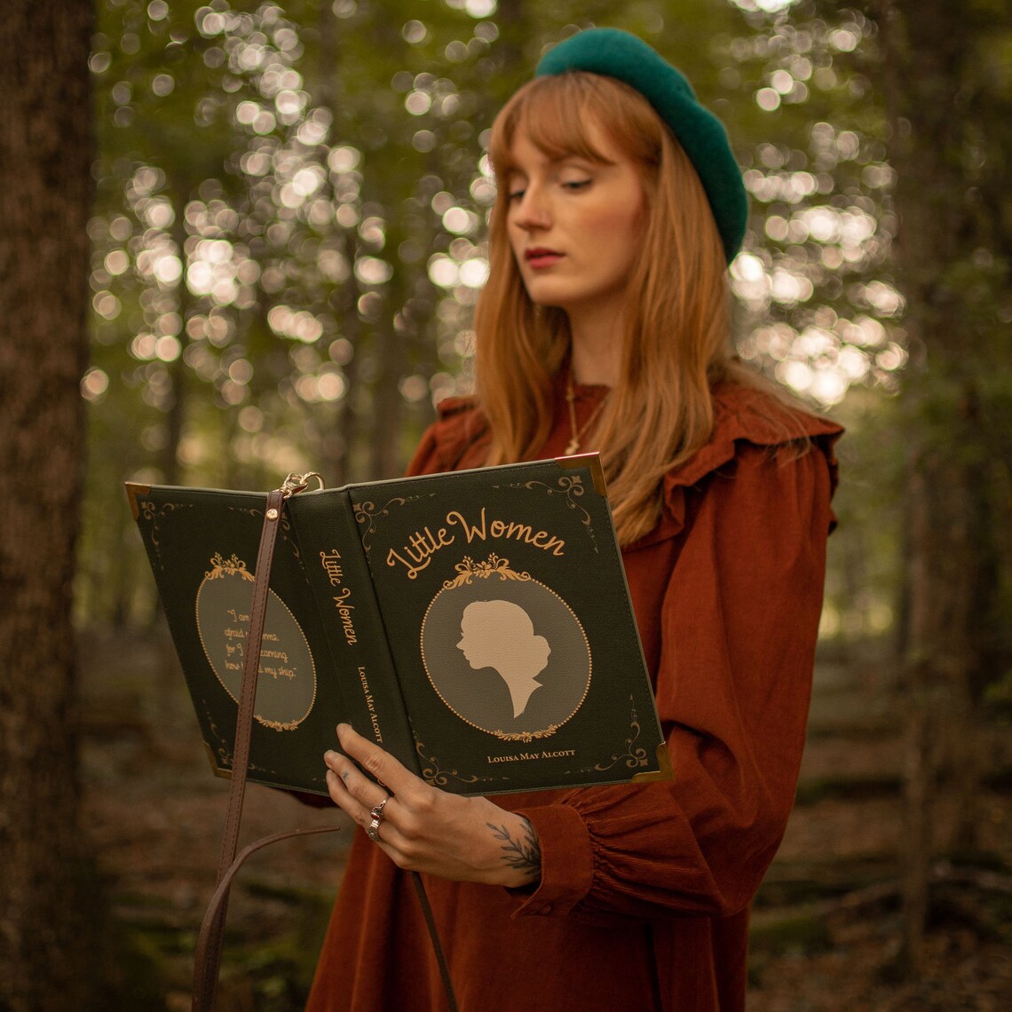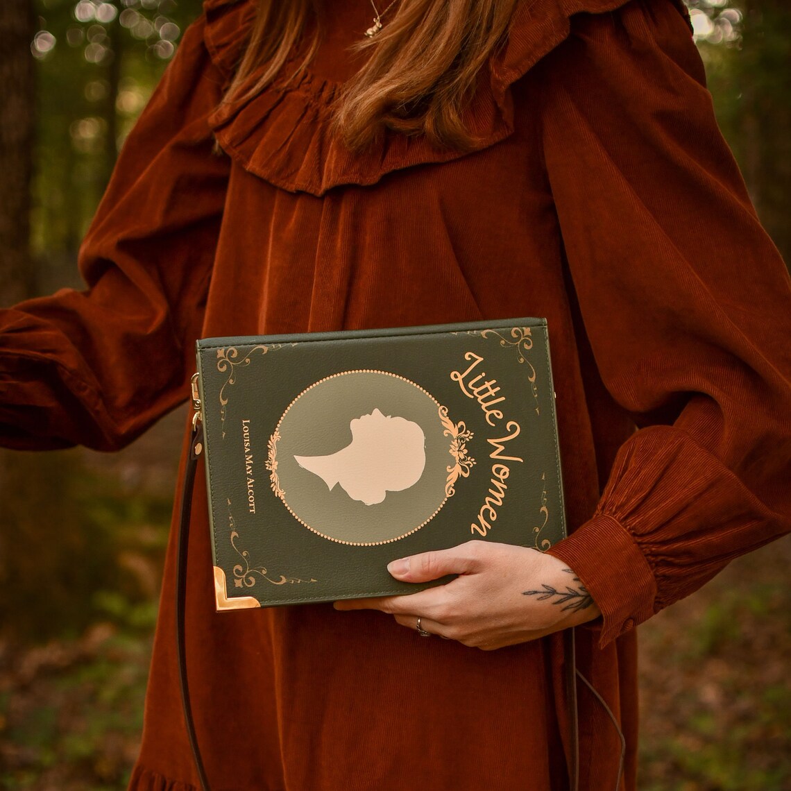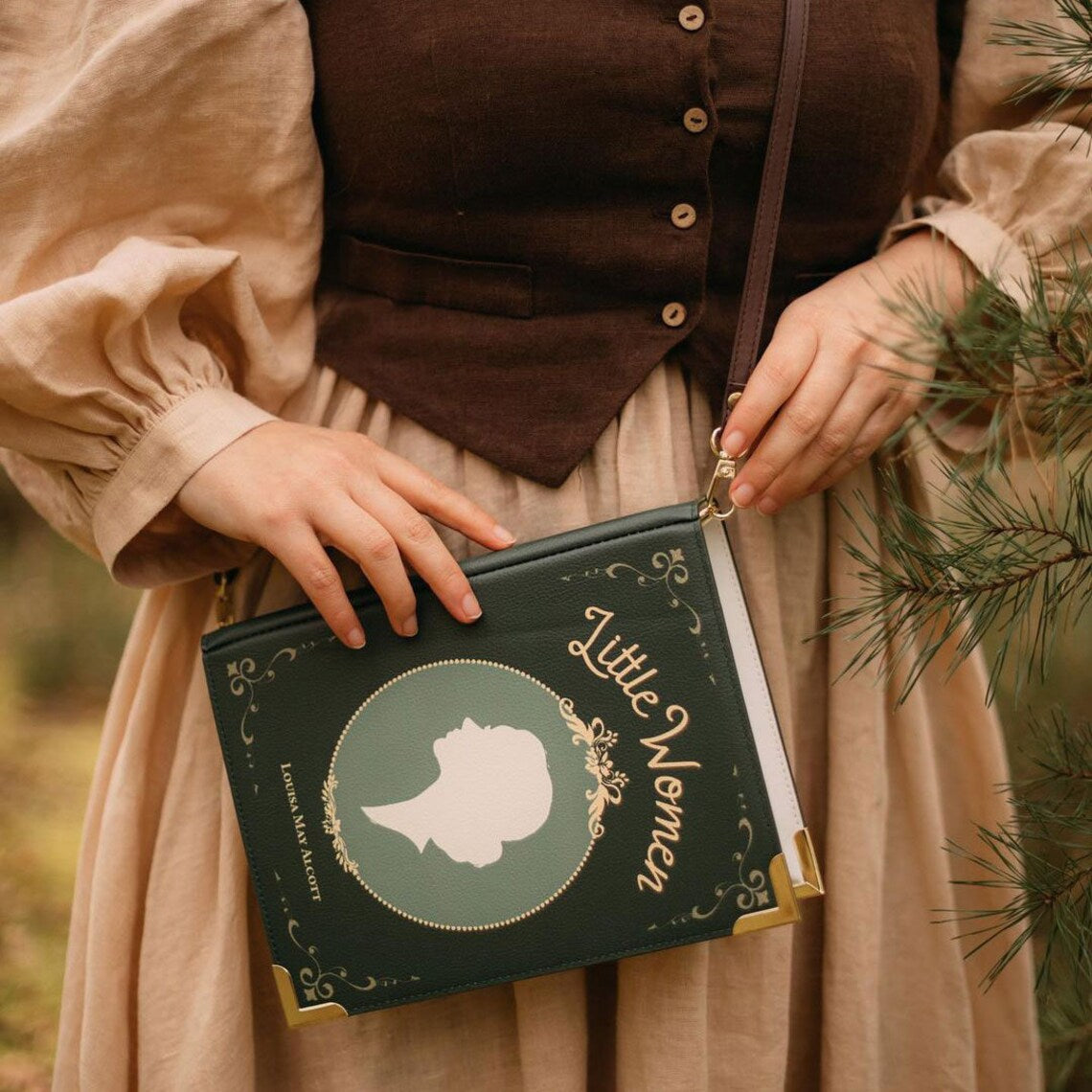 Inspirată de clasicul lui Louisa May Alcott, Little Women, geanta are un fundal verde pe care se află profilul unei femei într-o ramă ovală decorativă.