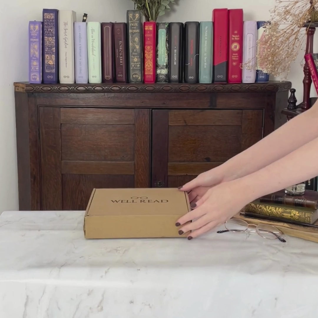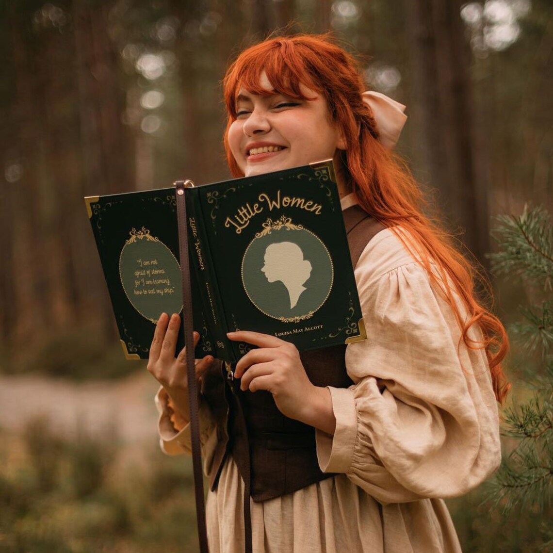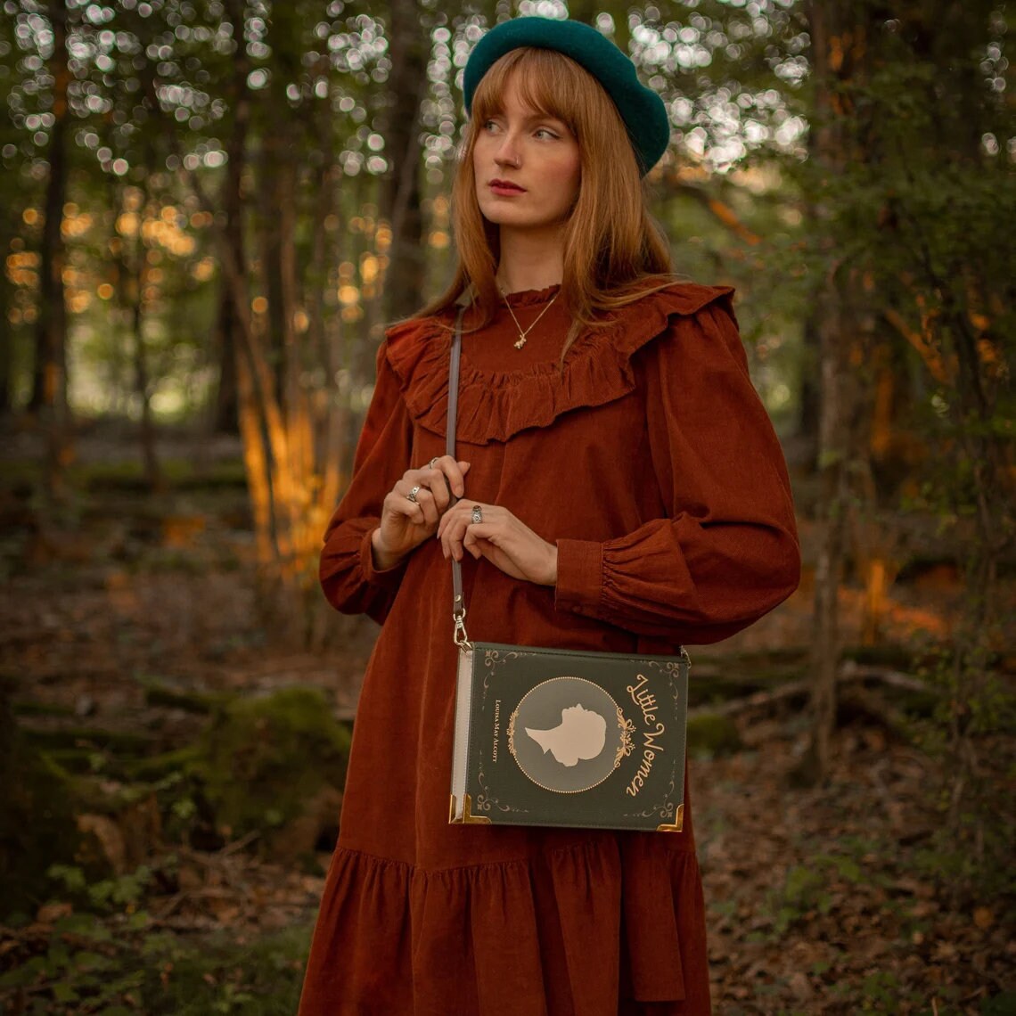 Inspirată de clasicul lui Louisa May Alcott, Little Women, geanta are un fundal verde pe care se află profilul unei femei într-o ramă ovală decorativă.