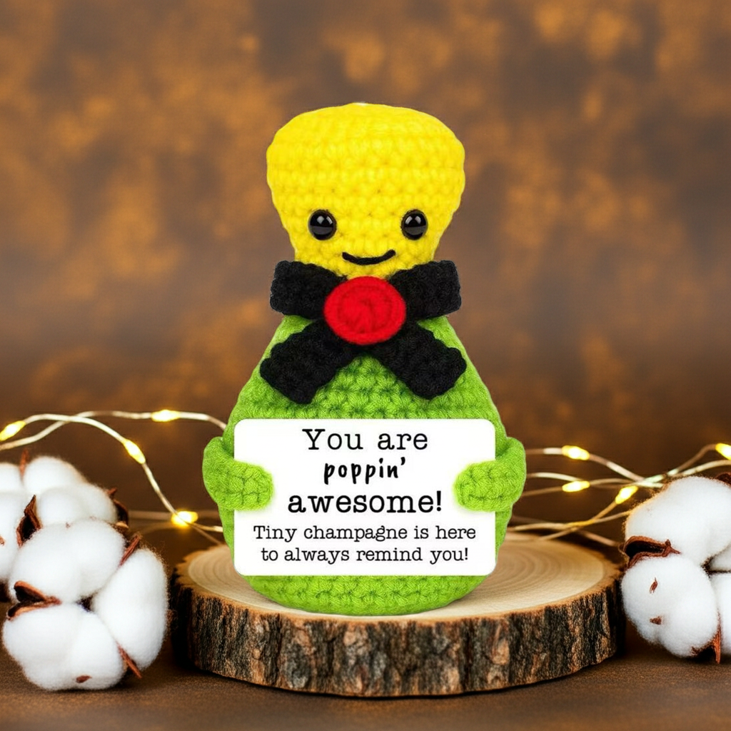Mascotă croșetată, model Șampanie, mesaj motivațional You are poppin' awesome