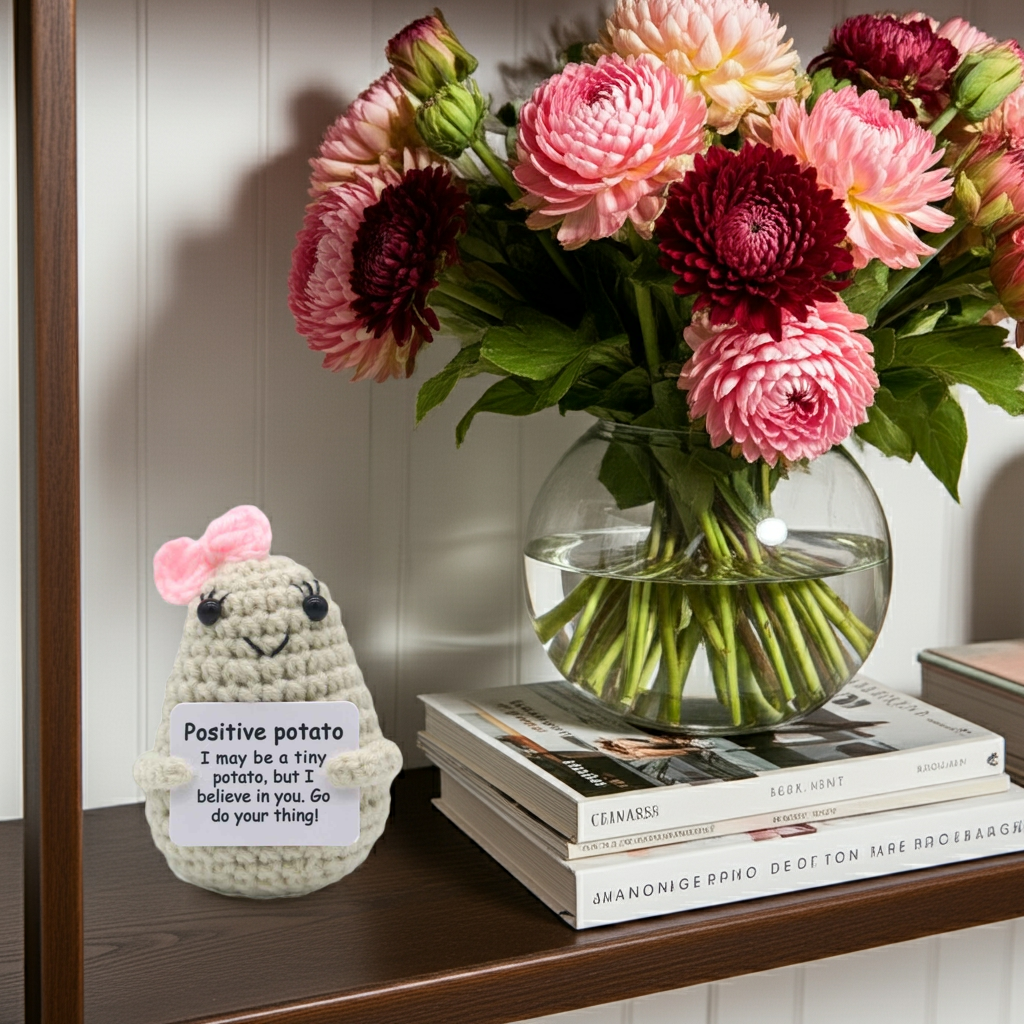 Cu mesajul „I might be a tiny potato, but I believe in you, go do your thing!”, această mascotă tricotată aduce un strop de motivație și încredere în fiecare zi.