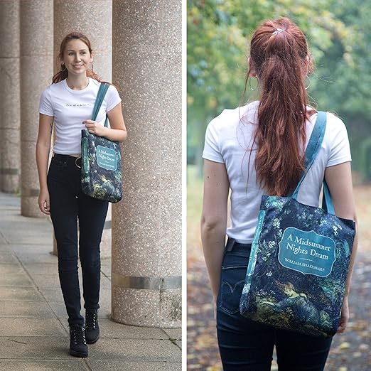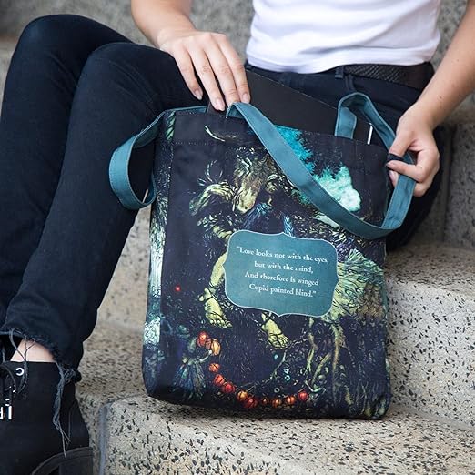 Această geantă tote practică, inspirată de piesa clasică a lui Shakespeare, A Midsummer Night’s Dream, prezintă pictura lui Arthur Rackham cu Tatiana adormită.