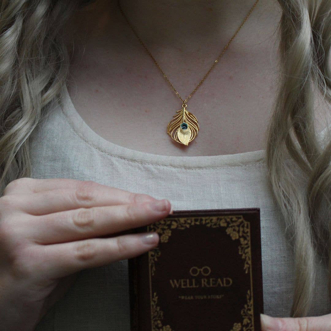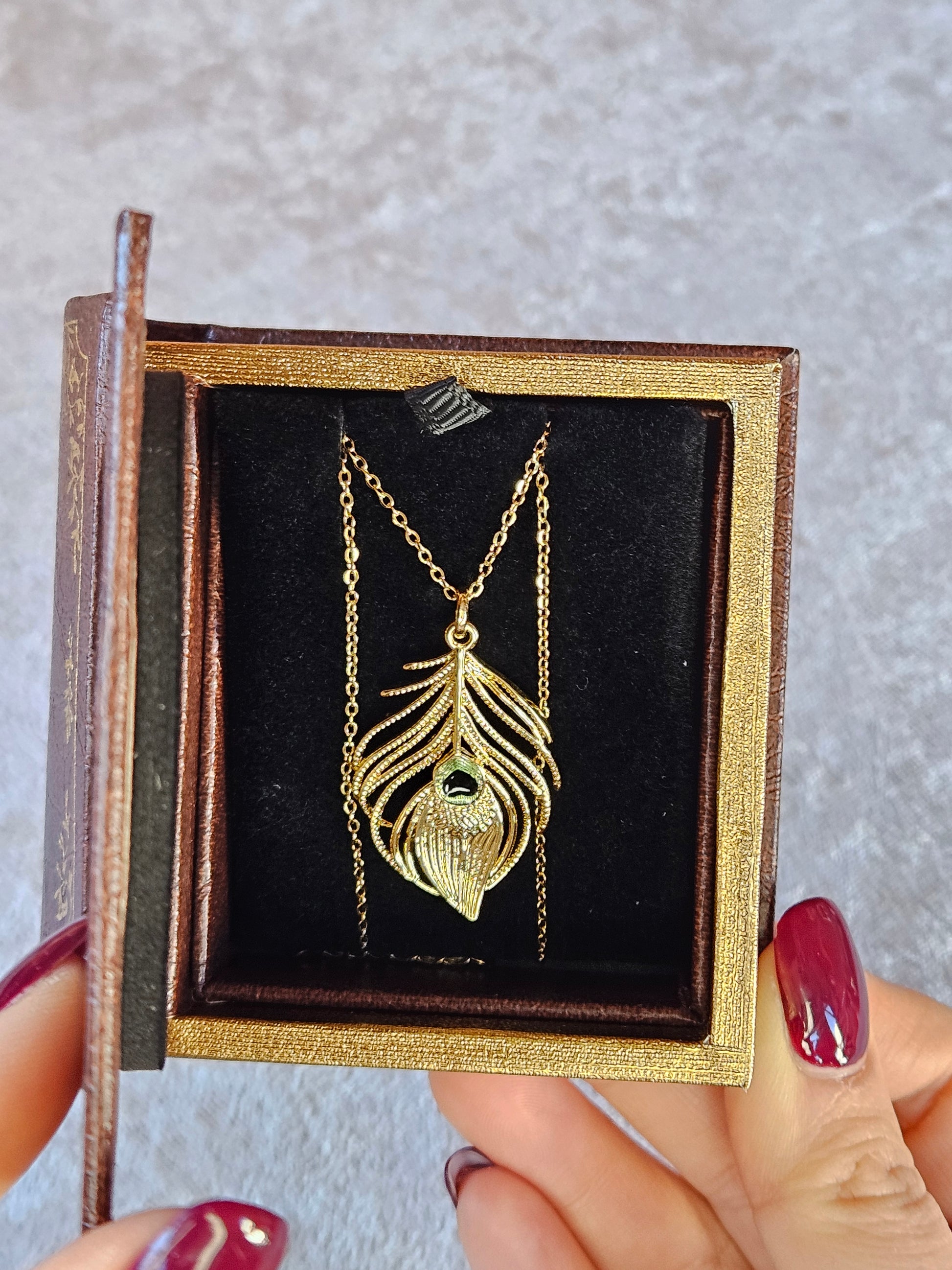 Pandantivul spectaculos prezintă o delicată pană de păun aurie, inspirată de designul iconic al copertei din 1813 realizată de Hugh Thomson, cu o piatră verde bogată în centrul său — un omagiu subtil pentru frumusețea detaliată a universului lui Jane Austen.