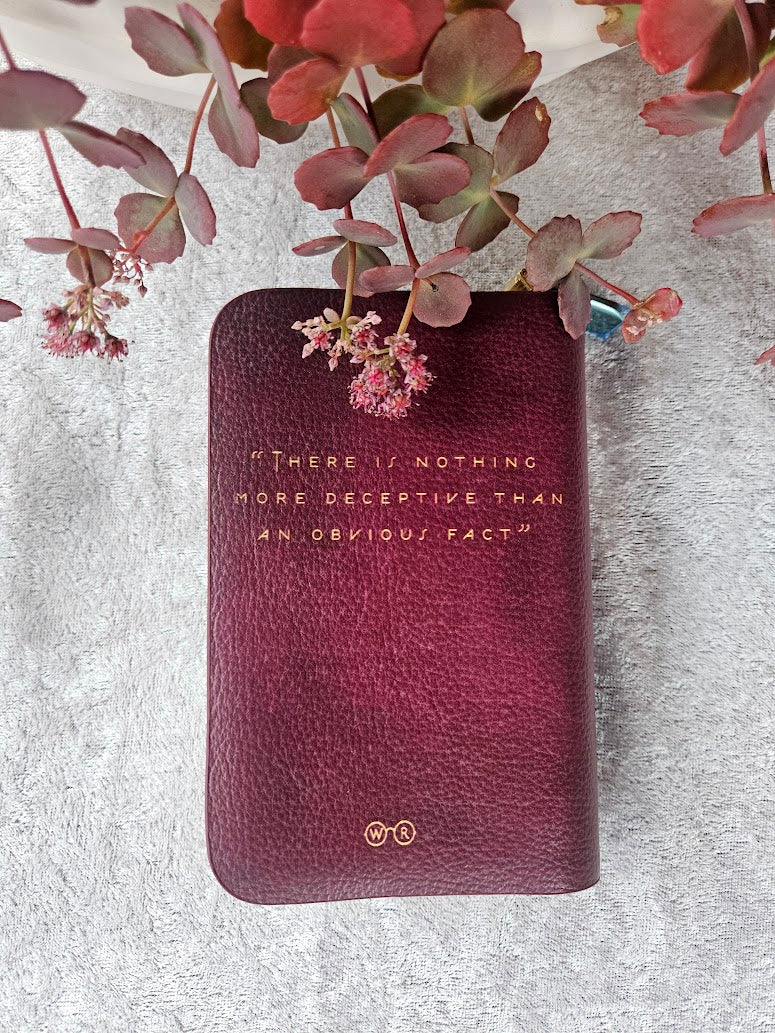 Pe spatele portofelului se află citatul: „There is nothing more deceptive than an obvious fact.”