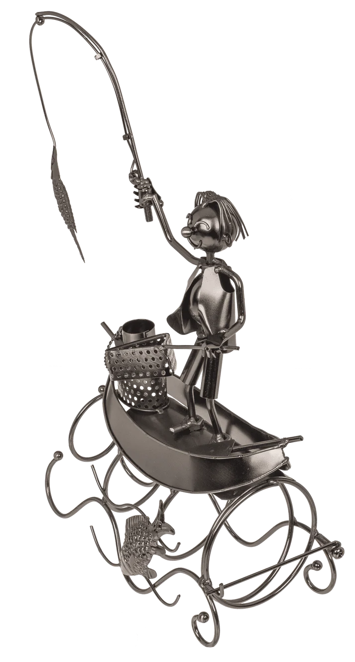 Designul stilizat, în formă de pescar, transformă o sticlă într-un obiect de decor cu personalitate, potrivit pentru interioare moderne și atent curate.