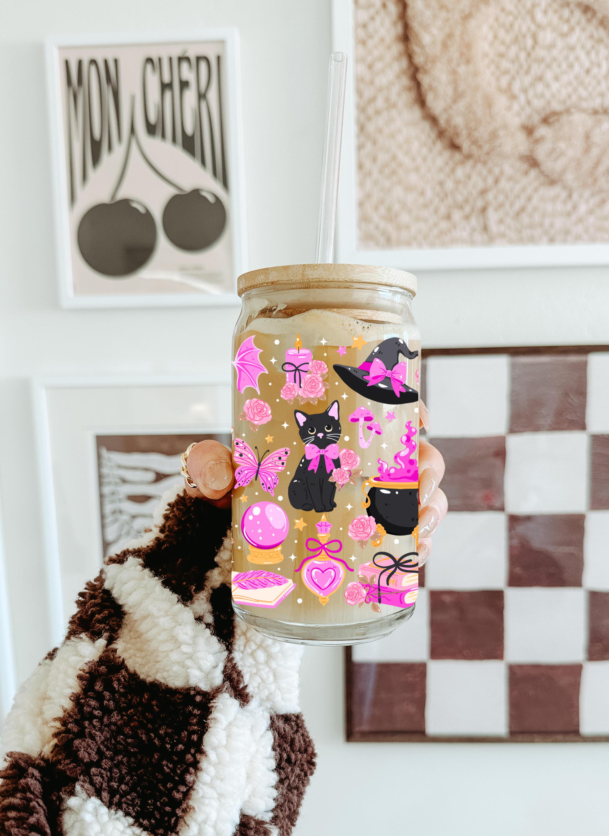 Tumbler "Witchy Cat", capac din bambus și pai + Cadou Set Coastere Lisa Parker